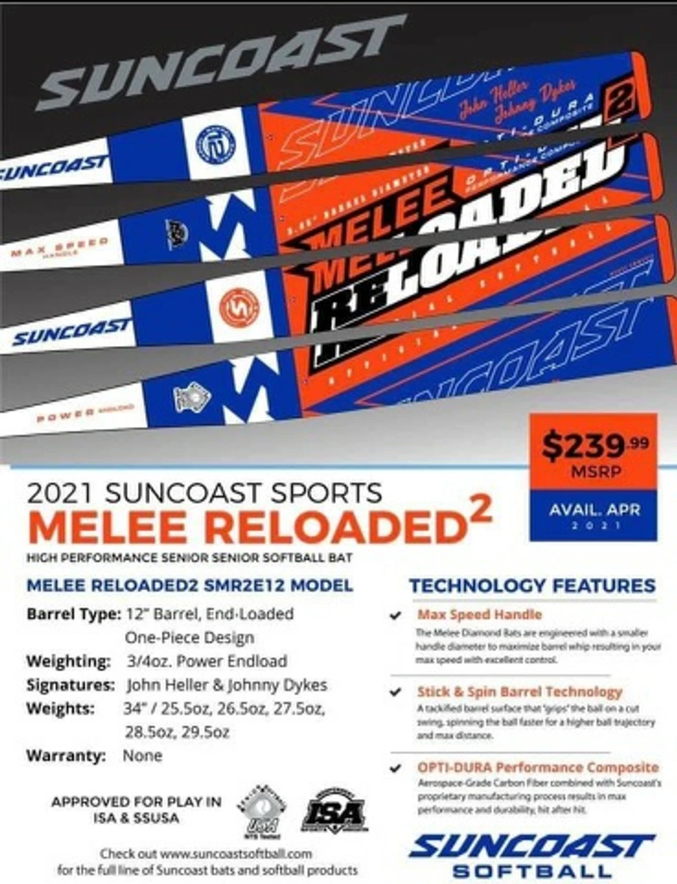 And the 1 piece Melee is BACK and better than ever! Introducing the 2021 Suncoast Melee Reloaded SSUSA softball bat. You want a BADA$$ bat, then look at this bad boy! Features a 12 inch 1 piece barrel with 3/4 oz end load. This thing CRUSHES! Breaks in very fast AND (somehow), holds compression. If opting for the shave, I would stay level 1 if you want to maintain some durability. Â